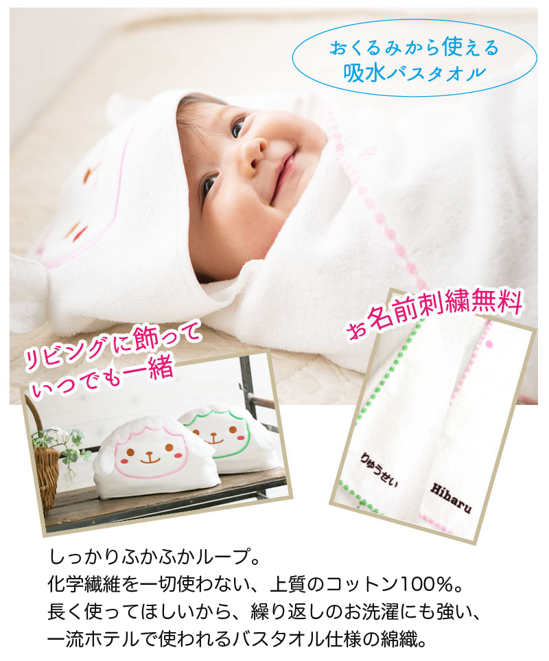 出産祝いにおくるみを贈りたいのだけれど、おくるみを使う時期って、あっという間におわってしまう。。。そんな悩みを解決したのが、おくるみバスタオルポンチョ。寝ることがなが~い新生児の間は、ふくふかループのタオルが優しく赤ちゃんを包み込み、赤ちゃんの心地よい睡眠をお手伝いします。サイズも通常のバスタオルポンチョよりタオルの長さをカットし、赤ちゃんを包み込むのに適切なサイズでおつくりしてます。新生児から5歳頃まで長くお使いいただけます。